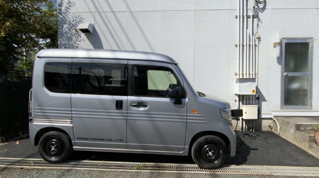 また、同時にEV自動車も購入しました。商用軽のホンダN-VAN e:です。軽ですが背が高く、助手席側にはセンターピラーが無いため、マネキンの入った段ボールもスムーズに問題なく積むことができました。