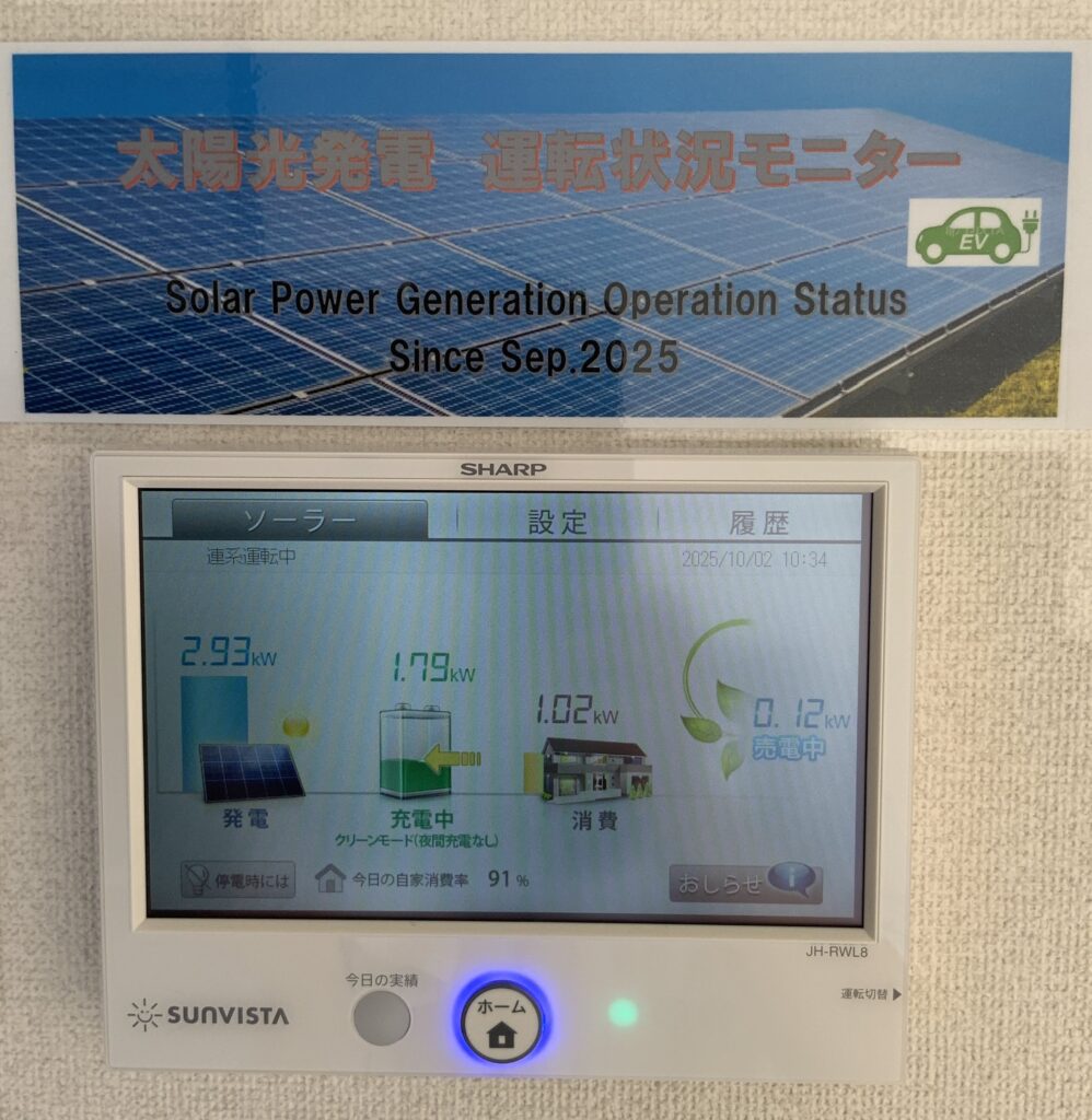 いよいよ弊社でも太陽光パネルと蓄電池を設置して、太陽光発電を開始しました。最近はペロブスカイト太陽電池など軽くて薄く柔軟な材料が製造され始め、今後は増えていきそうな状況ですが、今回は従来型の太陽光パネルをまずは小規模で導入し、社内で自然エネルギーの有用性を確認することとしました。やっぱり発電状況を見ていると、太陽光発電って有効ですね。